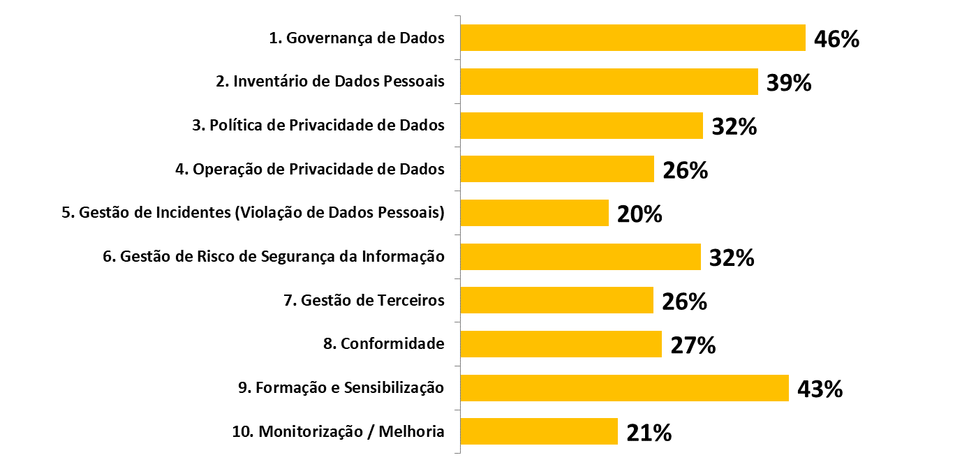 Após a avaliação das práticas atuais de gestão da proteção dados pessoais nestas organizações, encontramos um nível médio de adesão aos requisitos do RGPD de cerca de 30%.